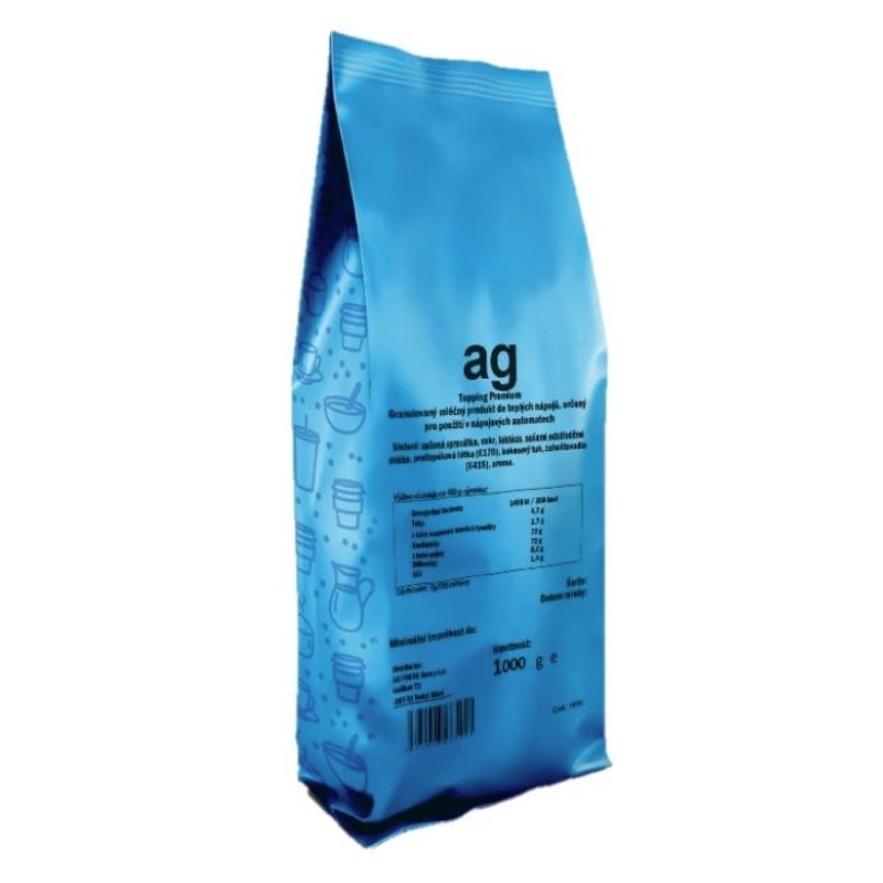 Sušený odstředěný mléčný topping v podobě granulát - skutečná chuť mléka. Určeno pro použití v nápojových automatech.Balení 1000g.
